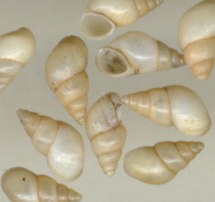 World wide, these are the small ones, ranging down almost to the microscopic. Magnifications used here are approximately 4 x and 8 x, for filenames ending with 300 and 600 respectively (see scales). In the author's experience in the south-central United States, such "microshells" are generally uncommon, only occasionally found in flood-deposited creek drift. In some instances they can be abundant, as in widely scattered springs, or at one locality in coastal Georgia where a few seeps flow around cement sidewalks, and another, a reach of the Chunkey River in Mississippi, where they swarmed over bedrock, filamentous algae, and sand. Thompson, in http://www. flmnh. ufl.edu/natsci/malacology/fl- snail/snails1.htm indicates that many species are annual, with a single brood, and a complete turnover of individuals every year. He also points out that there is a great deal more variation between various taxa than would be suggested by the often similar shells.