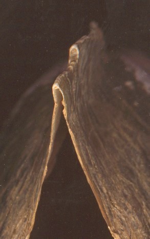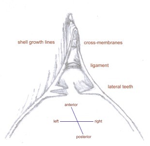 Lasmigona complanata, Potamilus ohioensis, Potamilus alatus, most Leptodea species (see below), and several others are more or less alate or winged. This characteristic has evolved in unionacean mussels more than once, in Africa, Asia, South America, and North America. The "wings" are extensions of composite shell material above the ligament, connecting the two valves at a sharp fold. This material is elastic and semi-flexible when wet and, like the ligament, tensioned against the adductor muscles to open the shell. The wings are best developed in young individuals, tending to break and frazzle as the animal matures. They become much more brittle when dry. For alate members of the family unionidae, any attempt to divide the two halves of the shell causes them to crack unevenly, like a chicken wishbone. Alate species tend to be thin-shelled, but many thin-shelled species are not. The function of the wing is unknown, but may be to protect the ligament, alter the flow of water over the siphon, or protect the siphon as the animal pulls itself forward through the substrate. It also causes the valves to press open more forcefully when the adductor muscles relax, an effect that could help the animal stay open as it moves. See http://members.aol.com/savetheclams/AsiaUnios.html (this site) for some more extreme examples.